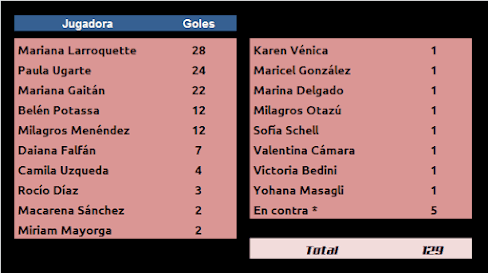 - Se toman como goles en contra los convertidos en propia valla y a favor de UAI por Dalia Chambl (Excursionistas), Melanie López (El Porvenir), María Luz Néspoli (UBA), Sabrina Barbitta (Racing Club) y Florencia Romero (Racing Club).